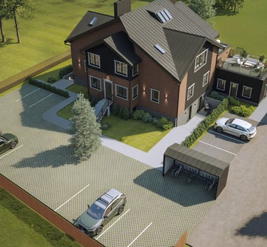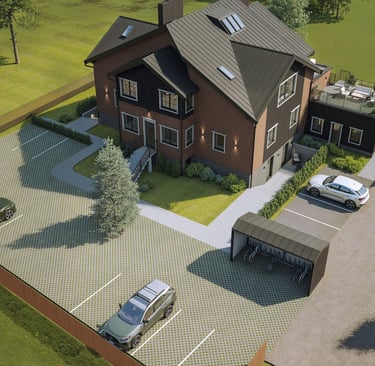 Projektą sudaro 16 funkcionalių apartamentų, įrengtų dviejų aukštų + mansardos name. Bendras plotas – 549 m², gyvenamasis – 440 m², sklypo plotas – 0,1929 ha. Objektas yra Placio g. 5, Karklėje – strategiškai patogioje vietoje, kur susijungia gamta, ramybė ir greitas pasiekiamumas.